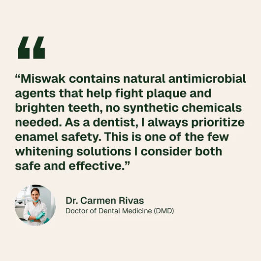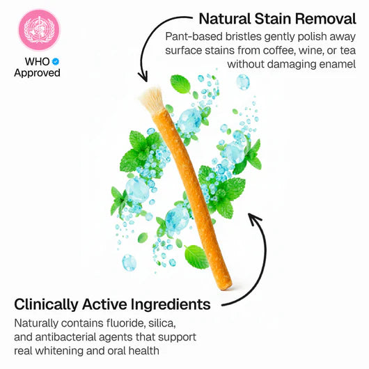 Miswak contains natural silica that gently lifts surface stains from coffee, tea, and soda.