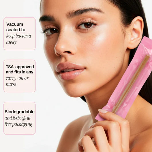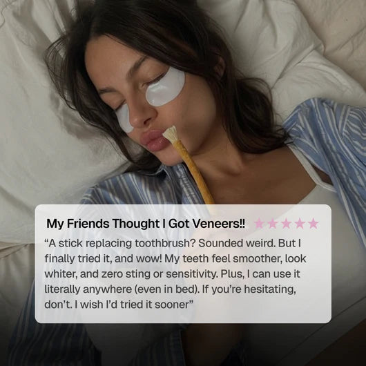 The tip frays into gentle bristles that clean your teeth. No toothpaste needed.
